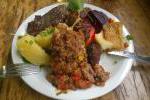 :) . W Brazylii bardzo popularne są restauracje oferujące jedzenie w formie bufetu, plus grill. Jedzenie takie kupuje się albo na kilogramy (ceny różne - najczęściej między 30 a 50 reali za kilogram) albo płacąc wcześniej kwotę stanowiącą całościową opłatę za nasz posiłek. Tutaj mieliśmy do czynienia z opcją drugą - all you can eat. Po zapłacie 28 reali, udałem się do bufetu,wybór duży i chciałem spróbować wszystkiego. Nie będąc do końca świadomym jak to działa nałożyłem sobie pokaźną porcję.