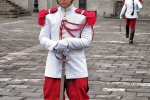 Mogliśmy więc podejrzeć kroczących powoli młodzianów, trzymających w dłoniach broń oraz sztandar niczym święte relikwie. Po całym układzie artystyczno-satyrycznym (no bo jak nazwać nieskoordynowane pląsanie kilku gości w stylu "2 kroki w lewo, 3 kroki do przodu, 2 kroki w prawo i tak 4 razy"???) panowie zajęli wreszcie docelowe miejsca. Stoją teraz dumni i niewzruszeni niczym posągi z odległej sąsiadki-Wyspy Wielkanocnej-prezentując światu swoje kamienne oblicza... Wsuwam delikatnie aparat przez kraty pałacowej bramy chcąc uwiecznić twarz stojącego nieopodal żołnierza. Patrzy prosto przed siebie, jego lico ani drgnie-a tak bardzo bym chciała, żeby się spojrzał prosto w aparat... I nie wiem czy tak jest, że nasze myśli maja jakąś moc i czasem do kogoś trafiają, czy też to był zwykły zbieg okoliczności, ale akurat w tym momencie-na tyle sprzętu i ciekawskich turystów-ów pan spojrzał się... prosto na mnie! Palec zareagował natychmiast otwierając na ułamek sekundy oko aparatu...